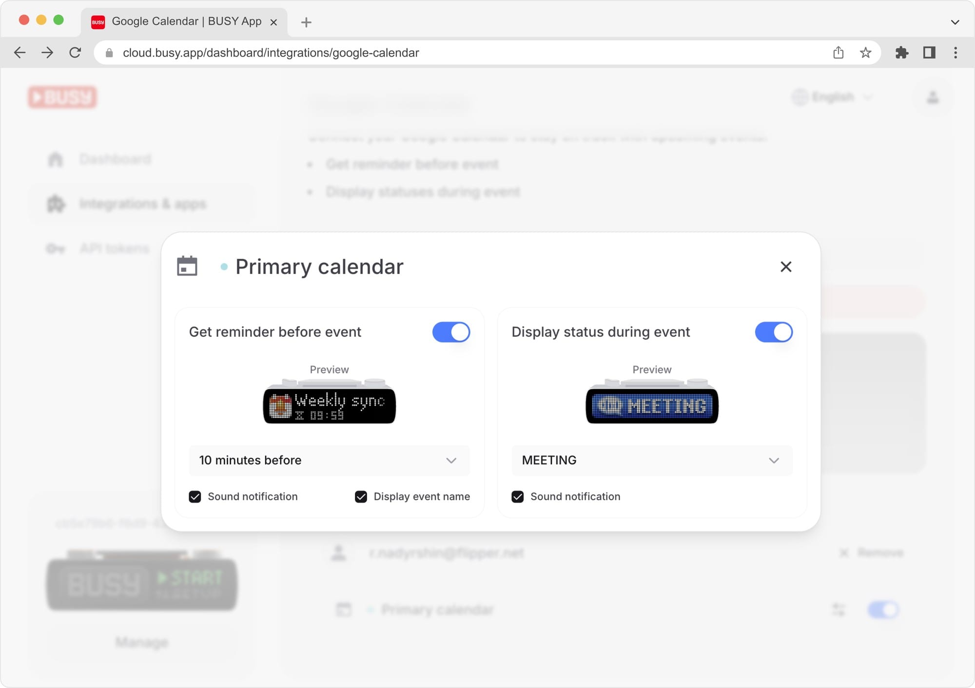We’ve added Google Calendar sync, allowing meeting and call information to show automatically on BUSY Bar. Before an event starts, BUSY Bar shows a reminder with a countdown timer. When the event begins, the device switches to your pre-selected status.